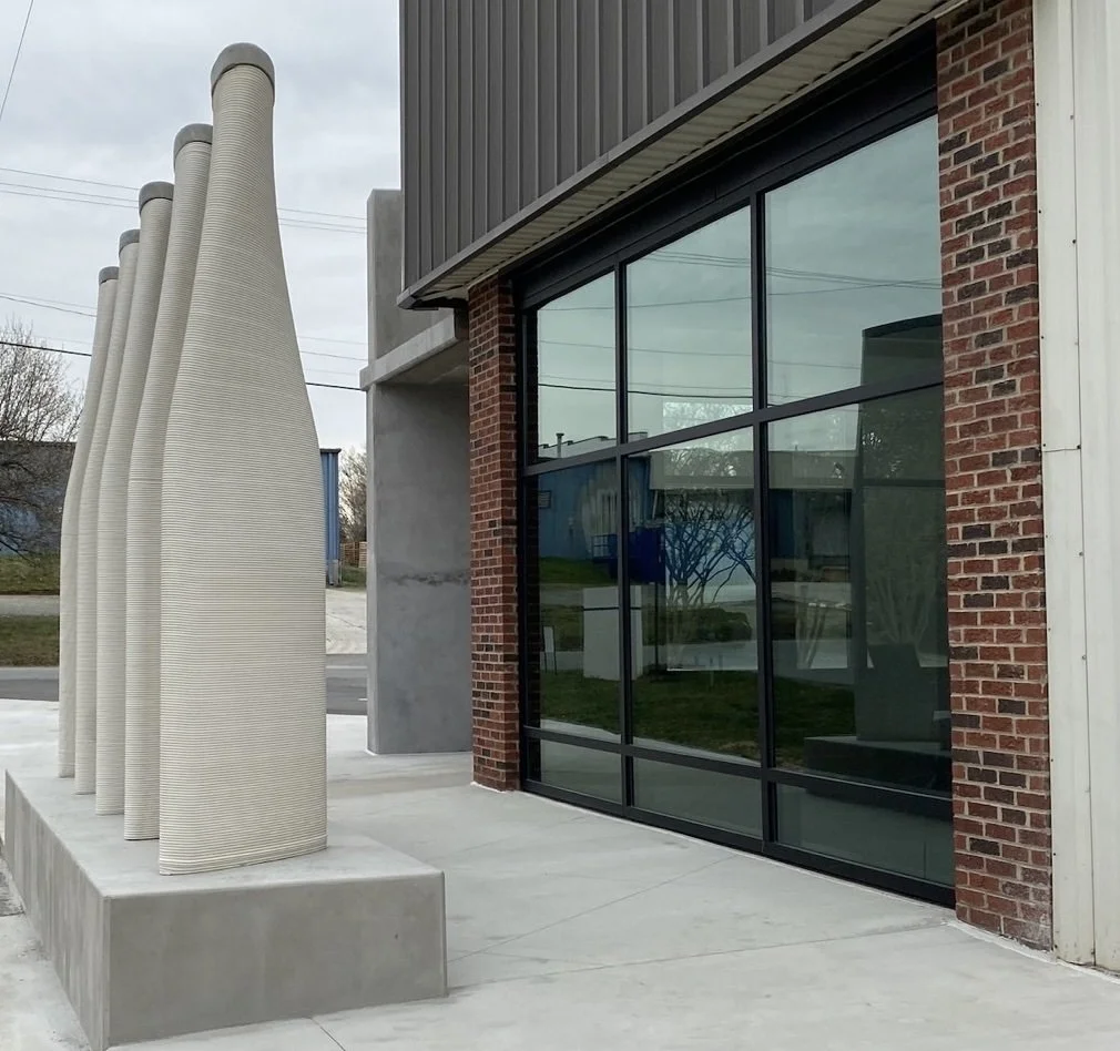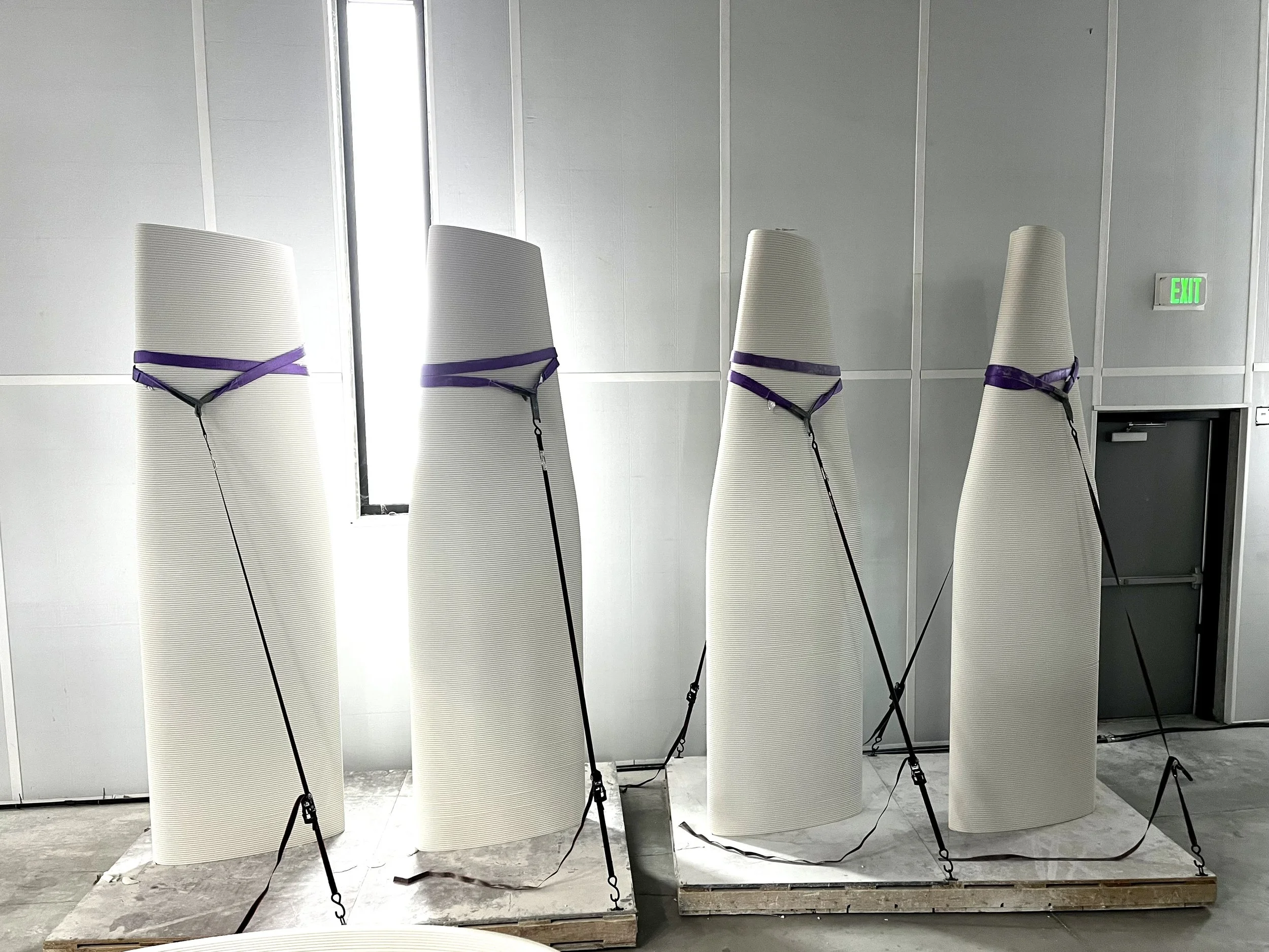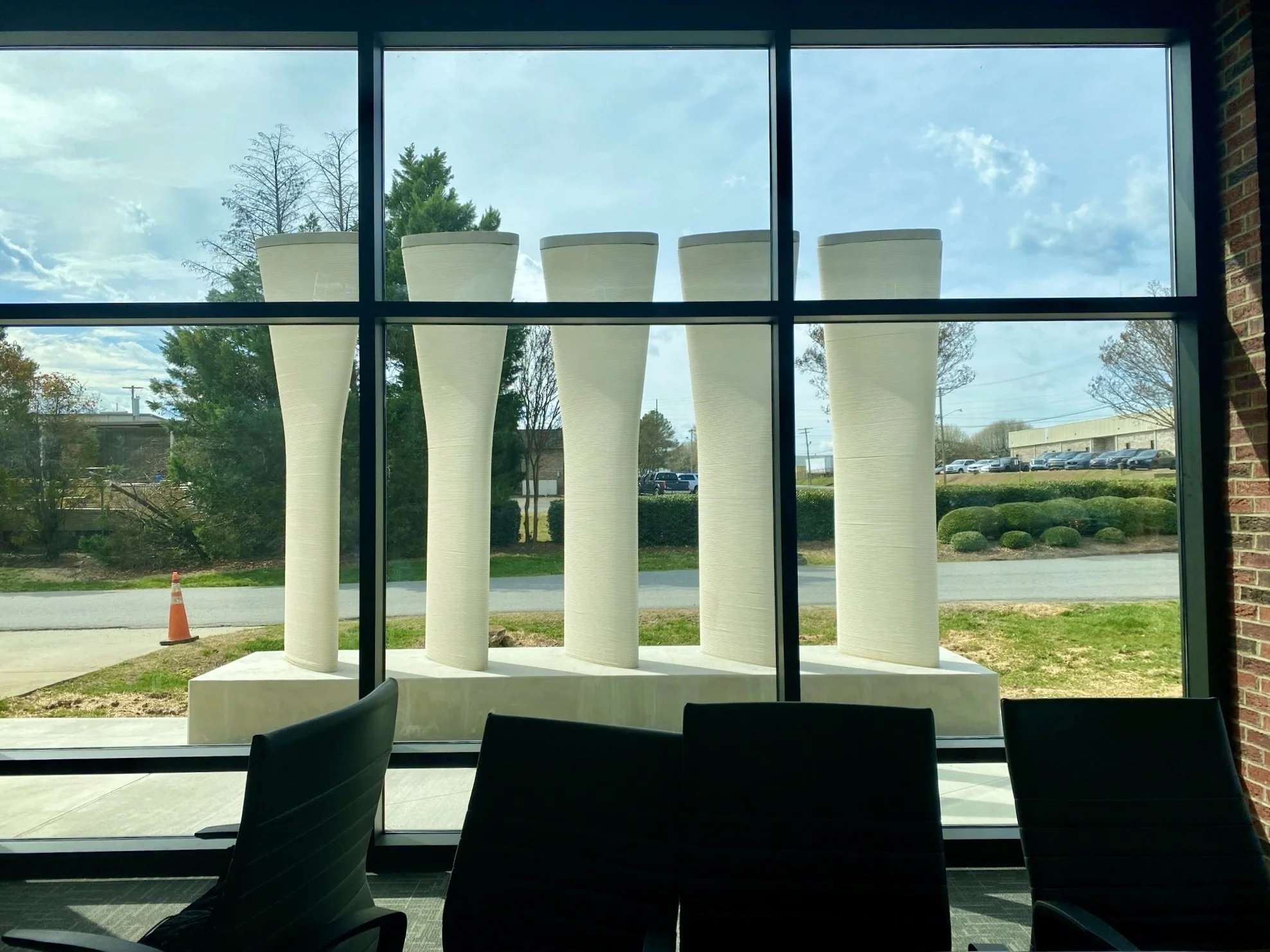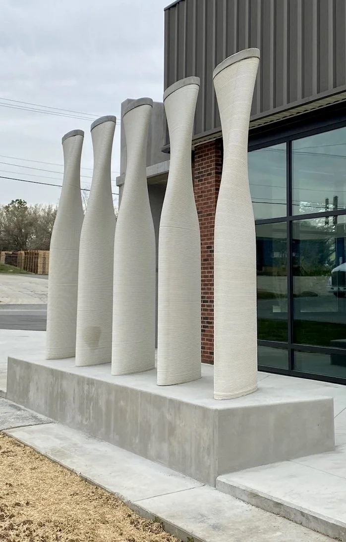 These vanes were designed as a protective art piece to provide shelter for the office structure. The unique design diverts the flow of wind away from the building while providing shade in the summer and privacy from the road. These ten-foot-tall columns were each printed in a single day and shipped out from the Pikus Lab shortly thereafter. Though the installation site had not been correctly prepared, the simple “drop-in-place” nature of 3D-printed elements allowed the crew to complete this project with minimal complications. The owners love it and these vanes function exactly how they were designed. Take a look at the artistic yet fully practical vanes in the photos below.